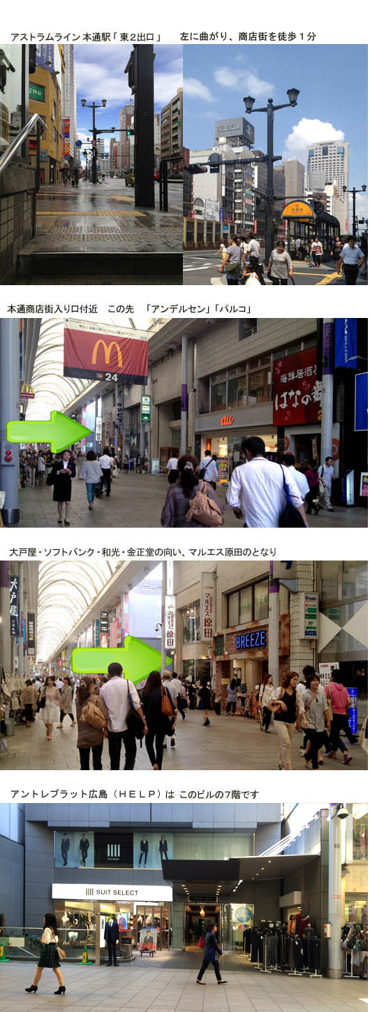 広島電鉄市内線「本通」駅、アストラムライン「本通駅東2出口」より、 本通商店街アーケードを「アンデルセン」「パルコ」方面(東側)に向かって徒歩約1分 右手のビルです。
